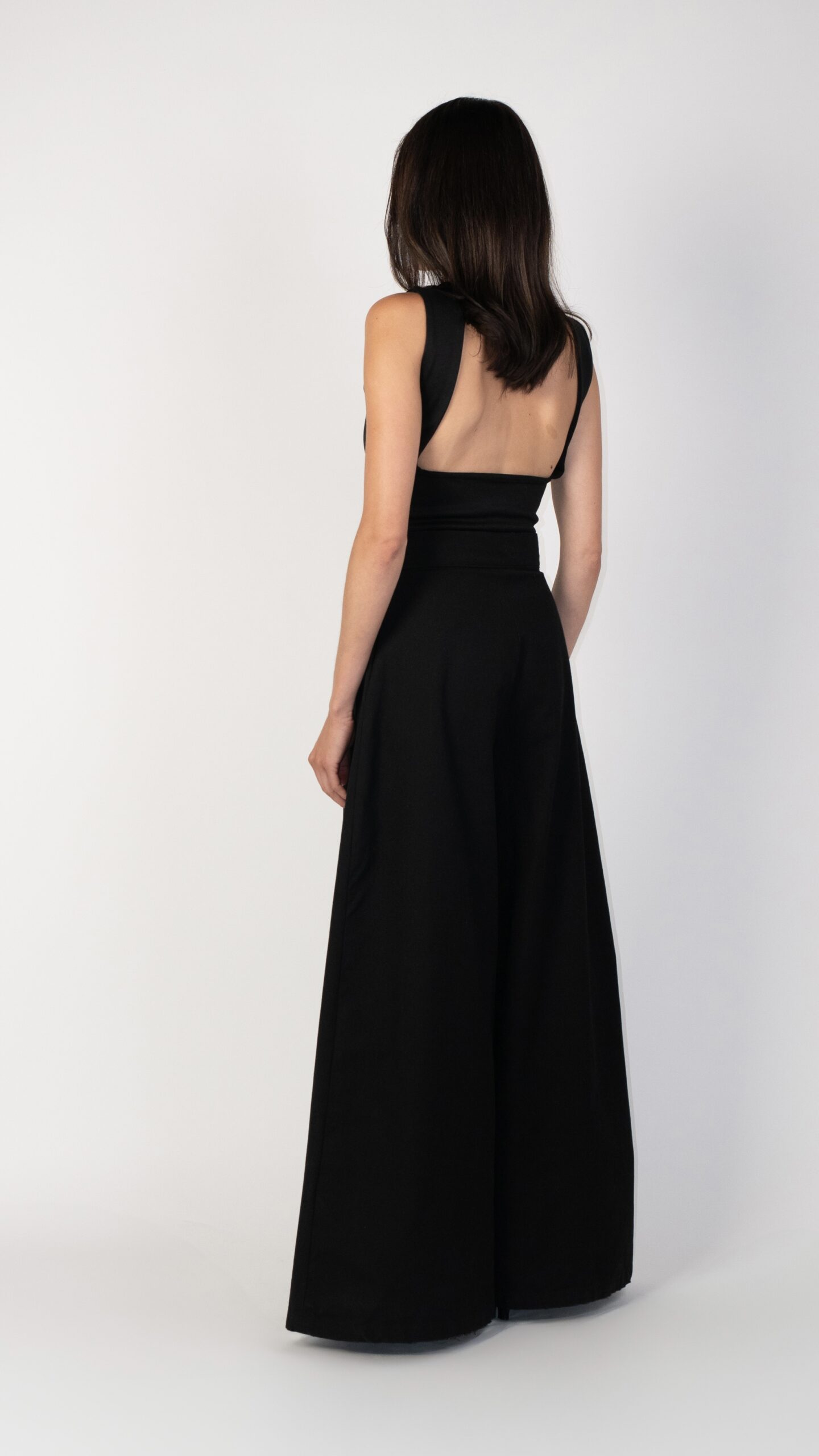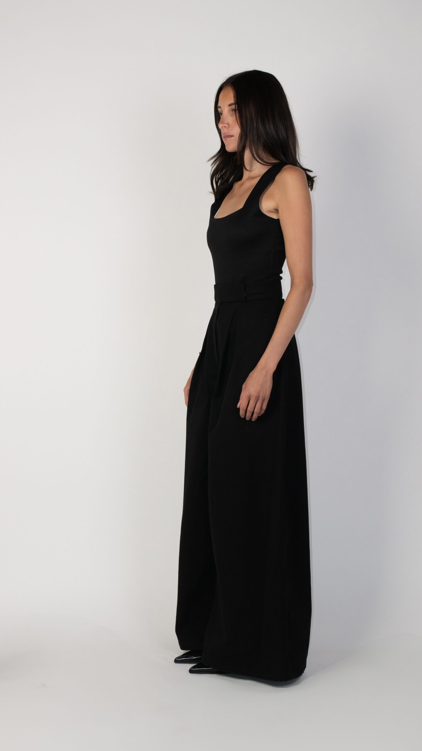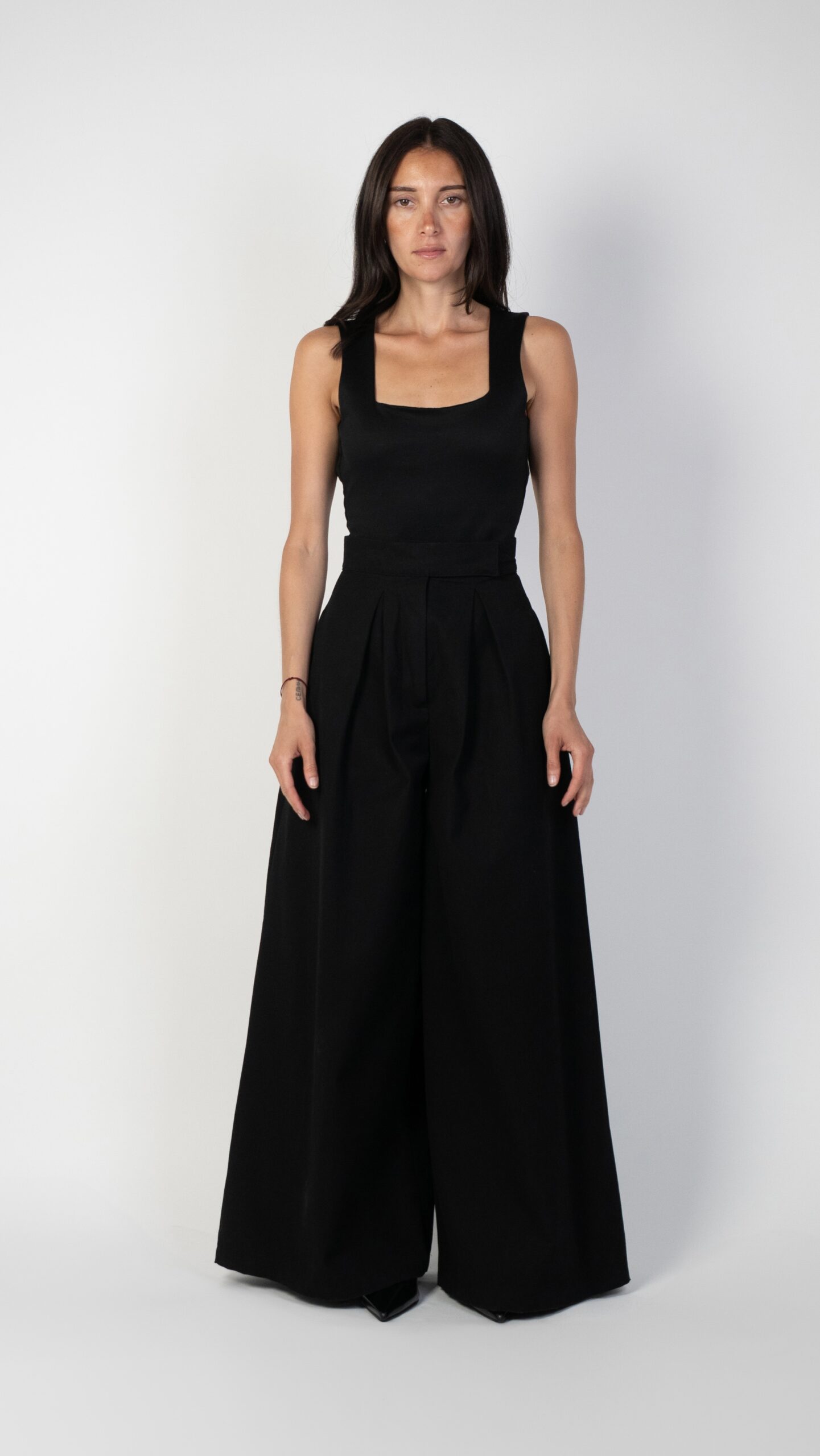 Pantalon cintré, coupe large, taille haute, crochets et zip avant. Poches latérales invisibles et